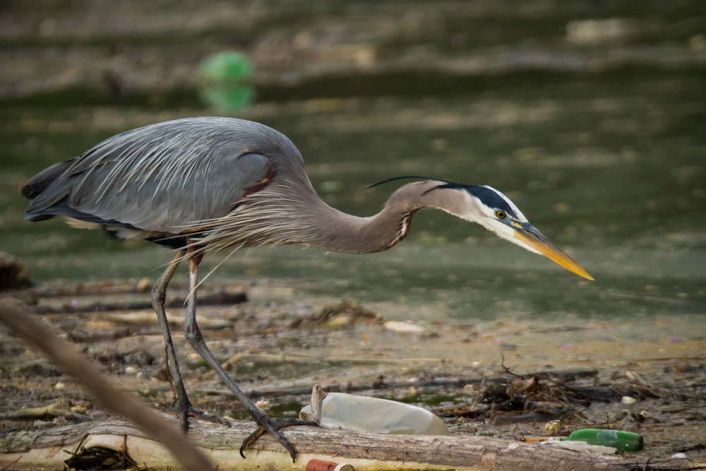 This great blue heron sits poised to grab a fish, but he is doing it on a pile of floating trash and debris that has floated to and collected at the Fort Patrick Henry Dam in Kingsport, TN. Trash such as a perfectly good basketball that has probably rolled down a hill in to the lake, a pill bottle, numerous cups and bottles of varying types, styrofoam from under docks along the lake, and natural debris such as limbs, logs, and general “muck” all gathers at the dam. This trash is a general eyesore and could be the end of this beautiful bird. He could easily get tangled in some fishing line or swallow something that would kill him as he goes for a fish. Littering and carelessness on the waters and at their edges have made a mess of this area.