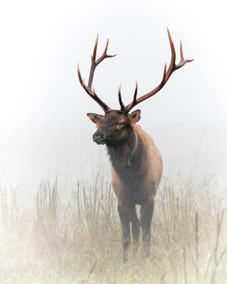 Elk buck emerging from the fog on a Fall morning at Cataloochee Valley