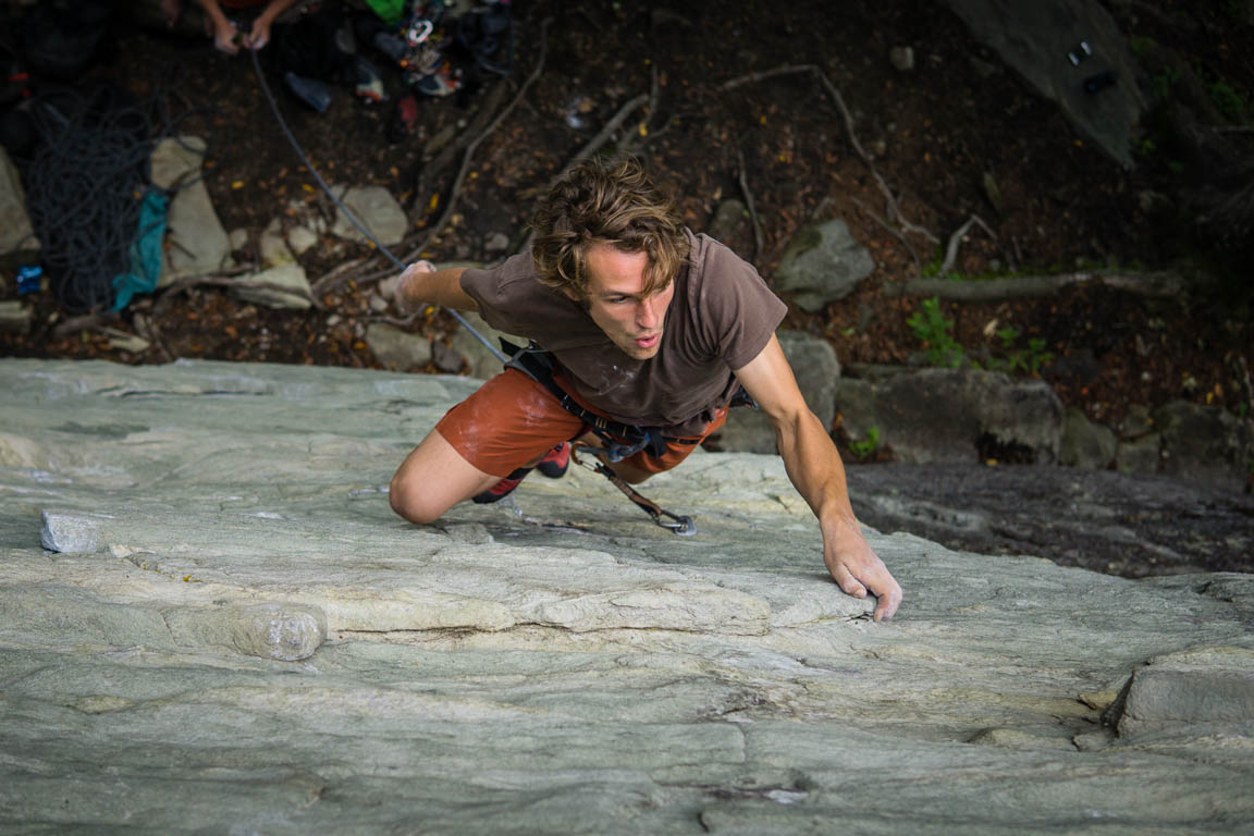 Kresten Anderson is known for keeping his cool when moves get tough high off the ground. If you ask for advice, he’ll tell you that breathing is key to keeping a calm mind. Here he is on Voodoo Child (5.11) at Warpin Endorphin, a small crag on the flanks of Grandfather.