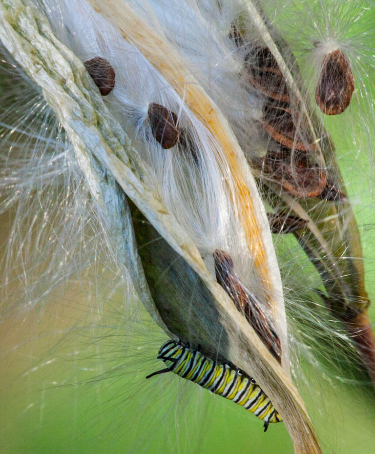 Tiny Monarch Caterpillar feeding on milkweed as the seed pods open. It is so important to plant milkweed in your yard…as we have moved onto the land, we have lost a lot of the milkweed that the monarchs depend on for food.
