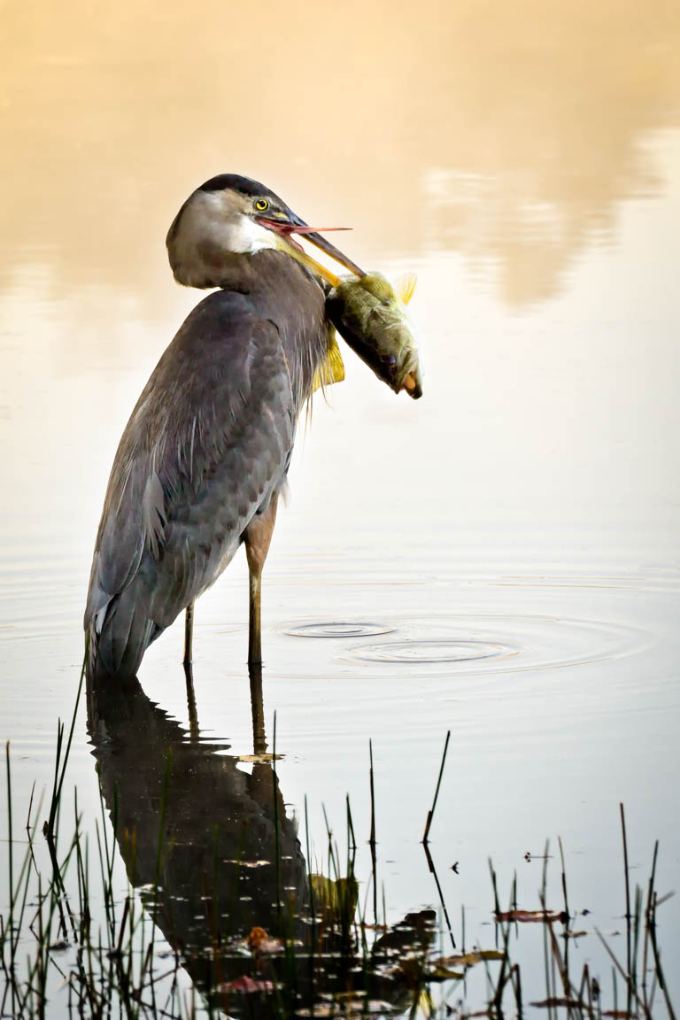 In the very early morning light I spent 45 minutes watching this Great Blue Heron. After a while he started dunking his head into the water very slowly. I thought he had the fish between his beak and that he was either trying to keep it alive or enjoy his catch. It was not until later when I looked at the images I had captured that morning, that I realized he had speared the bass. His behavior was so interesting as he would keep dunking it almost to keep it alive. He then quickly and forcefully dropped his beak into the water and he came up without the bass and flew off. I remained in amazement.