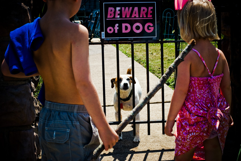 Two Harlan, KY children size up the threat of attack from the neighborhood guard dog. Moments after this image was captured, the dog was licking their outstretched hands begging to have his head rubbed.