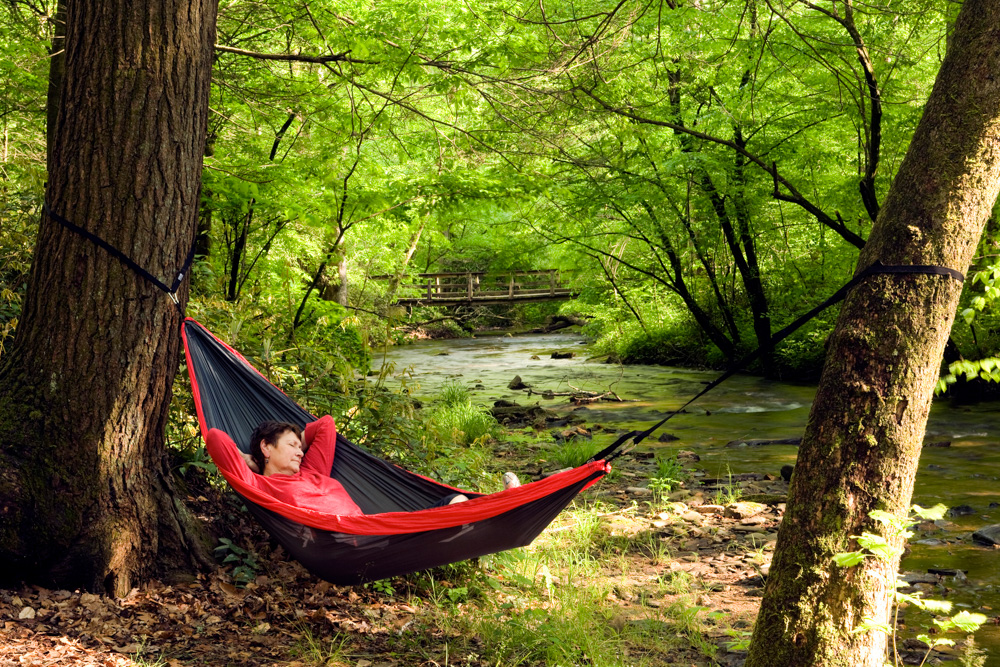 Woman relaxing in a hammock. Pisgah National Forest, North Carolina